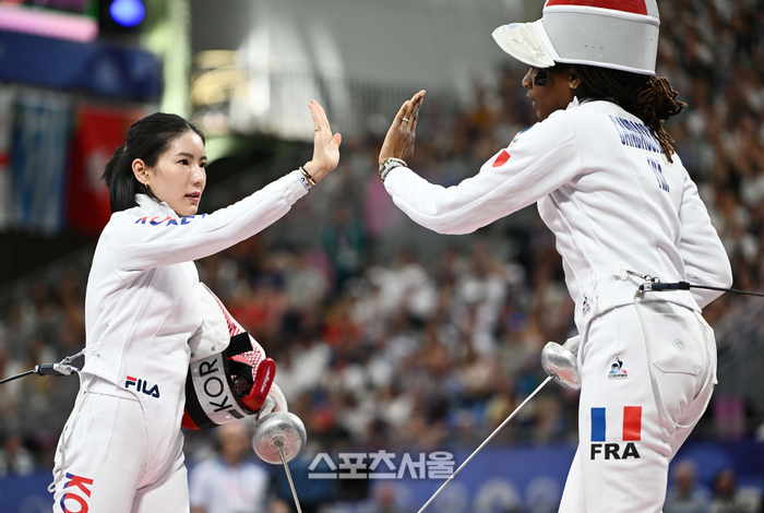 펜싱 여자 대표팀의 송세라가 30일(한국 시간) 프랑스 파리 그랑팔레에서 열린 2024 파리올림픽 펜싱 여자 에페 단체전에서 첫 선수로 나와 상대팀과 인사를 하고 있다. 한국은 31-37로 패하며 준결승 진출이 좌절됐다. 2024. 7. 30.