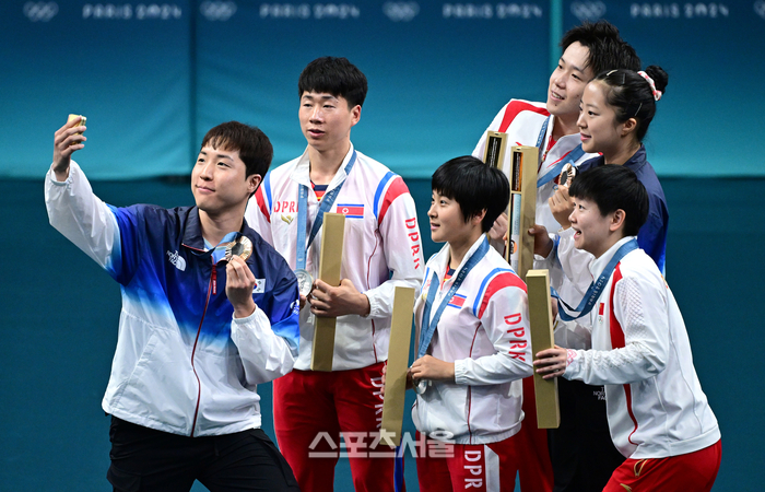 탁구 대표팀의 신유빈-임종훈 조가 30일 (한국 시간) 프랑스 파리 사우스 파리 아레나4에서 열린 2024 파리올림픽 탁구 혼성 복식에서 동메달을 딴 뒤 금메달 중국 왕추친-쑨잉사, 은메달 북한 리정식-김금용과 함께 기념사진을 찍고 있다. 2024.07.30.