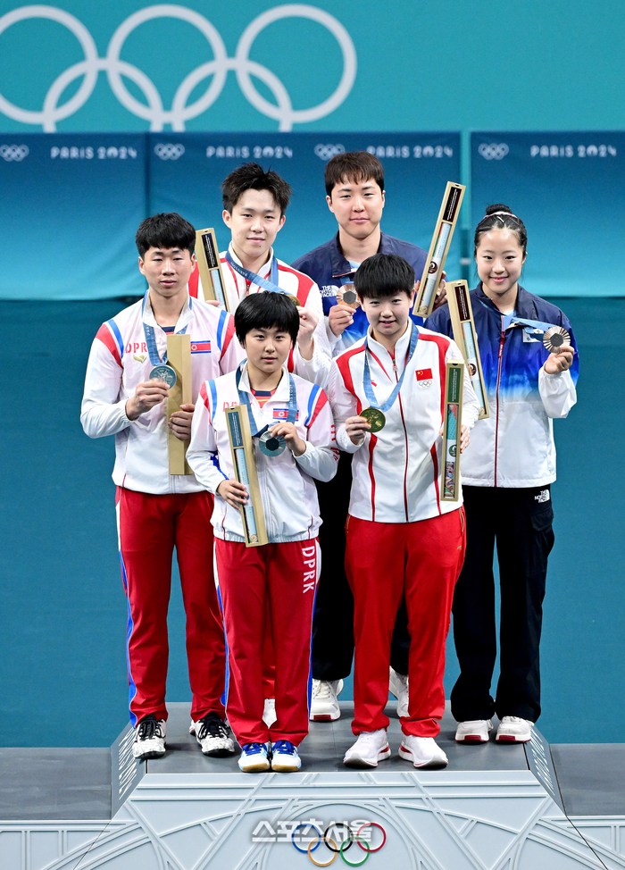 탁구 대표팀의 신유빈-임종훈 조(오른쪽)가 30일 (한국 시간) 프랑스 파리 사우스 파리 아레나4에서 열린 2024 파리올림픽 탁구 혼성 복식에서 동메달을 딴 뒤 금메달 중국 왕추친-쑨잉사, 은메달 북한 리정식-김금용과 함께 기념사진을 찍고 있다. 2024.07.30.