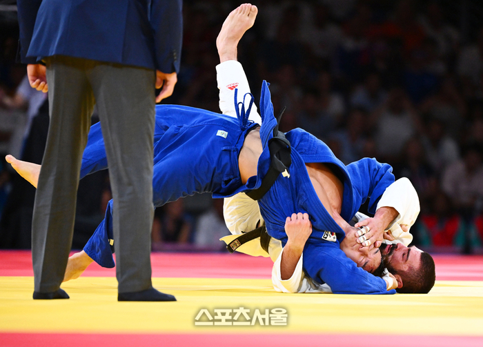 유도 국가대표 이준환(왼쪽)이 30일(한국 시간) 프랑스 파리 샹드마르스 아레나에서 열린 2024 파리올림픽 남자 유도 -81㎏급 준결승에서 조지아의 그리갈라쉬빌리에게 공격을 허용하고 있다. 2024. 7. 30.