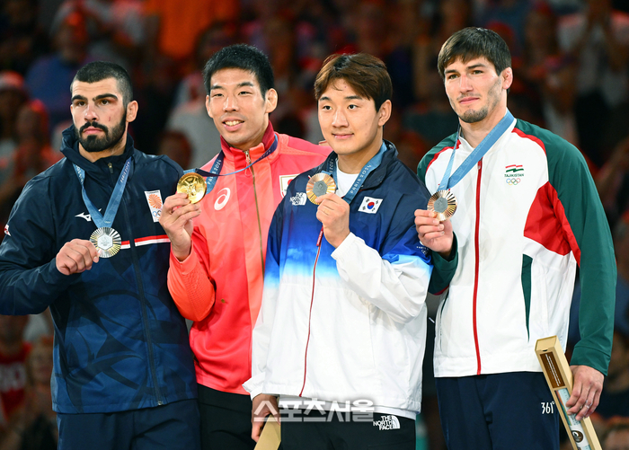 유도 국가대표 이준환(오른쪽 둘째)이 31일(한국 시간) 프랑스 파리 샹드마르스 아레나에서 열린 2024 파리올림픽 남자 유도 -81㎏급에서 동메달을 딴 뒤 메달리스트들과 함께 기념촬영을 하고 있다. 왼쪽부터 조지아 그리갈라쉬빌리(은메달), 일본 나가세(금메달), 한국 이준환(동메달), 타지키스탄 막흐마드베코프(동메달). 2024. 7. 31.