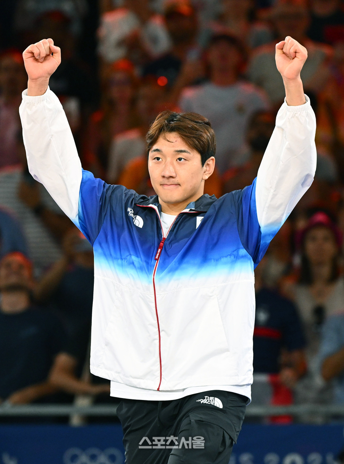 유도 국가대표 이준환(오른쪽 둘째)이 31일(한국 시간) 프랑스 파리 샹드마르스 아레나에서 열린 2024 파리올림픽 남자 유도 -81㎏급에서 동메달을 딴 뒤 두 손을 번쩍 들며 시상대에 오르고 있다. 2024. 7. 31.