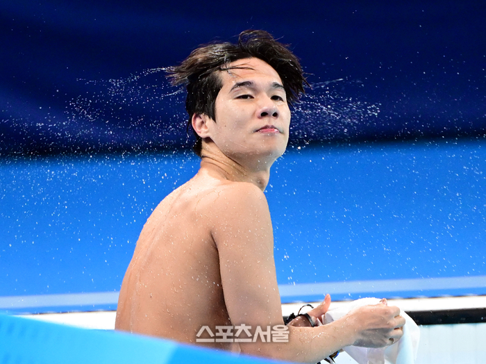 수영 대표팀의 김민섭이 31일(한국 시간) 프랑스 파리 라 데팡스 아레나에서 열린 2024 파리올림픽 수영 접영 200m 준결선에서 역영을 한 두 머리의 물을 털어내며 최종 순위를 기다리고 있다. 김민섭은 전체 13위로 결선 진출에 실패했다. 2024. 7. 31.