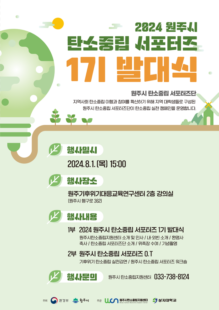 이번 행사는 1부 발대식과 2부 오리엔테이션으로 나뉘어 2시간 동안 진행되며, 원주시의원 및 각 대학과 도내 시·군 탄소중립지원센터 관계자 등이 참석하여 함께 자리를 빛낼 예정이다.
