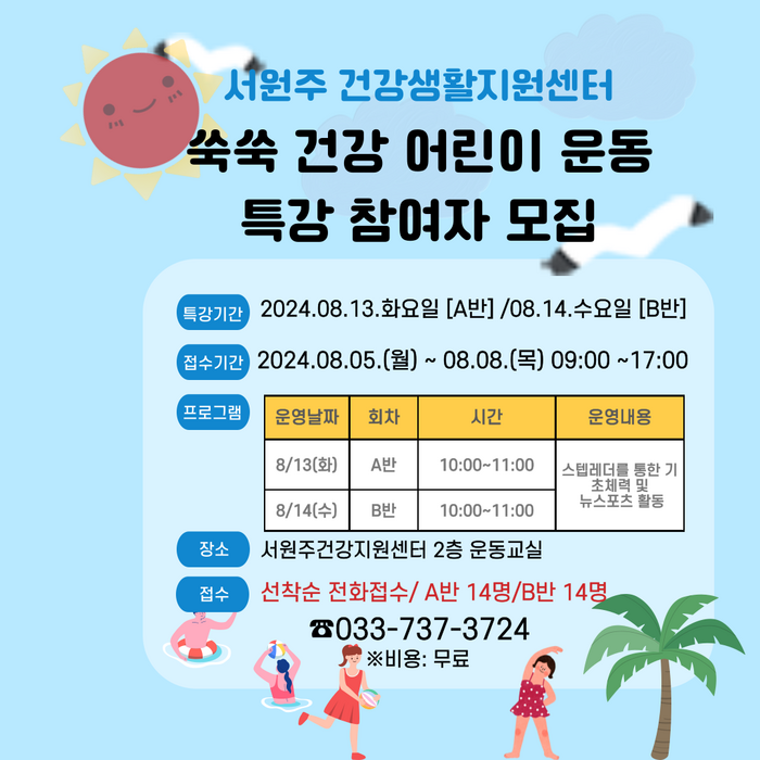 [스포츠서울ㅣ원주=김기원기자]서원주건강생활지원센터는 여름방학을 맞이하여 어린이들의 기초체력 운동 및 대근육활동을 통해 비만을 예방하고 운동하는 습관을 형성할 수 있는 ‘쑥쑥 건강 어린이 운동 특강’ 프로그램을 운영한다.