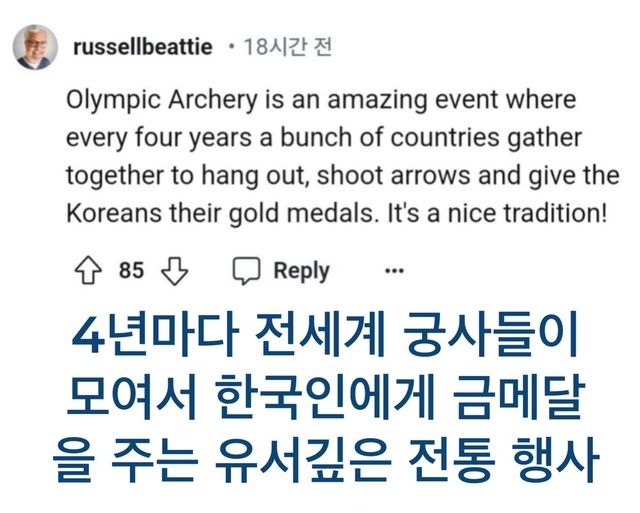 한 외국인은 자신의 SNS에 올림픽 양궁 종목에 대해 새로운 정의를 내리며 한국팀을 찬양했다. 러셀 비티라는 이름의 한 외국인은 양궁을 “4년마다 전세계 궁사들이 모여서 한국인에게 금메달을 주는 유서깊은 전통행사”라고 정의, 한국 양궁대표팀에 경의를 표했다.