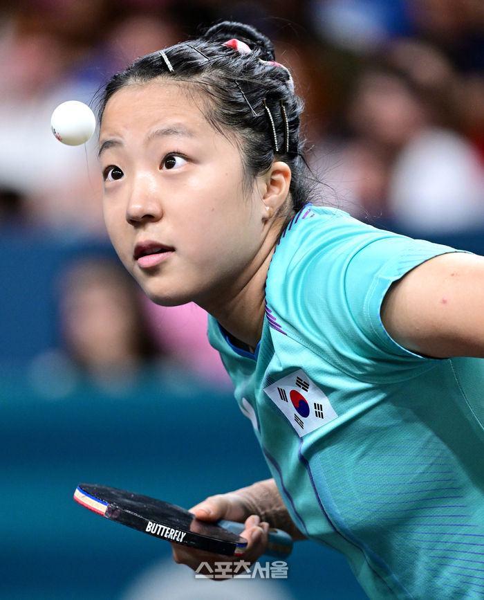 탁구 국가대표 신유빈이 31일 (한국 시간) 프랑스 파리 사우스 파리 아레나4에서 열린 2024 파리올림픽 탁구 여자 단식 32강에서 헝가리의 조지나 포타를 상대로서브를 넣고 있다. 신유빈은 세트 스코어 4-1로 16강에 올랐다. 2024. 7. 24.