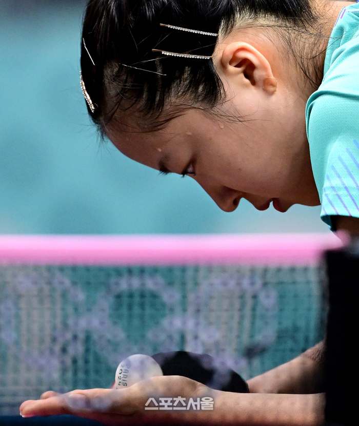 탁구 국가대표 신유빈이 31일 (한국 시간) 프랑스 파리 사우스 파리 아레나4에서 열린 2024 파리올림픽 탁구 여자 단식 32강에서 헝가리의 조지나 포타를 상대로 서브를 넣고 있다. 신유빈은 세트 스코어 4-1로 16강에 올랐다. 2024. 7. 24.