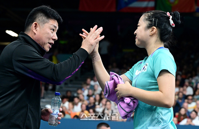 탁구 국가대표 신유빈이 31일 (한국 시간) 프랑스 파리 사우스 파리 아레나4에서 열린 2024 파리올림픽 탁구 여자 단식 32강에서 헝가리의 조지나 포타를 상대로 승리를 한 뒤 오광헌 감독과 하이파이브를 하고 있다. 신유빈은 세트 스코어 4-1로 16강에 올랐다. 2024. 7. 24.