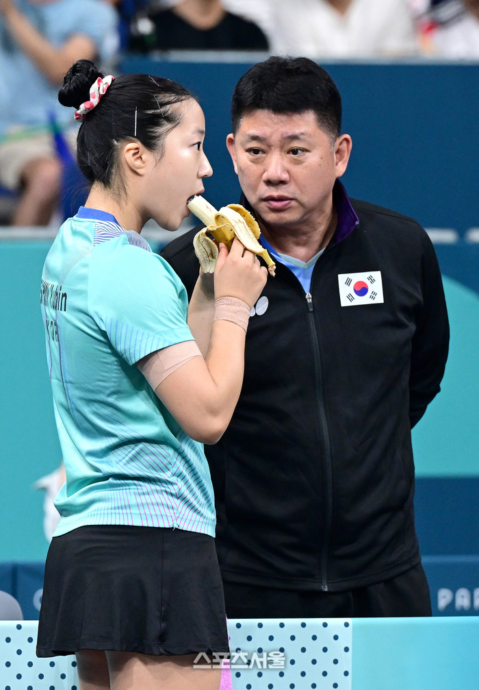 탁구 국가대표 신유빈이 31일 (한국 시간) 프랑스 파리 사우스 파리 아레나4에서 열린 2024 파리올림픽 탁구 여자 단식 32강에 앞서 오광헌 감독과 이야기를 나누고 있다. 신유빈은 세트 스코어 4-1로 16강에 올랐다. 2024. 7. 24.