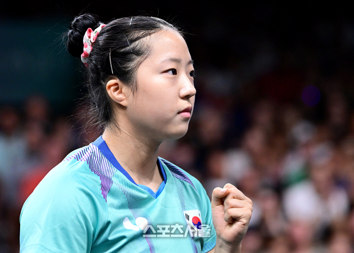 탁구 국가대표 신유빈이 31일 (한국 시간) 프랑스 파리 사우스 파리 아레나4에서 열린 2024 파리올림픽 탁구 여자 단식 32강에서 헝가리의 조지나 포타를 상대로 득점한 뒤 주먹을 불끈 쥐고 있다. 신유빈은 세트 스코어 4-1로 16강에 올랐다. 2024. 7. 24.