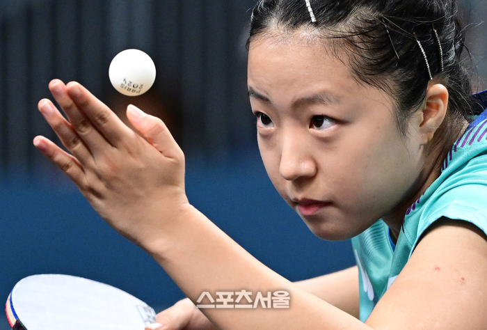 탁구 국가대표 신유빈이 31일 (한국 시간) 프랑스 파리 사우스 파리 아레나4에서 열린 2024 파리올림픽 탁구 여자 단식 32강에서 헝가리의 조지나 포타를 상대로 서브를 넣고 있다. 신유빈은 세트 스코어 4-1로 16강에 올랐다. 2024. 7. 24.