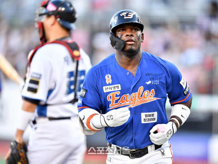한화 1번타자 페라자가 31일 수원KT위즈파크에서 열린 2024프로야구 KT위즈와 한화이글스의 경기 1회초 선두타자로 나와 고영표를 상대로 선제 우월 솔로홈런을 터트린 후 홈인하고 있다.. 2024.07.31.