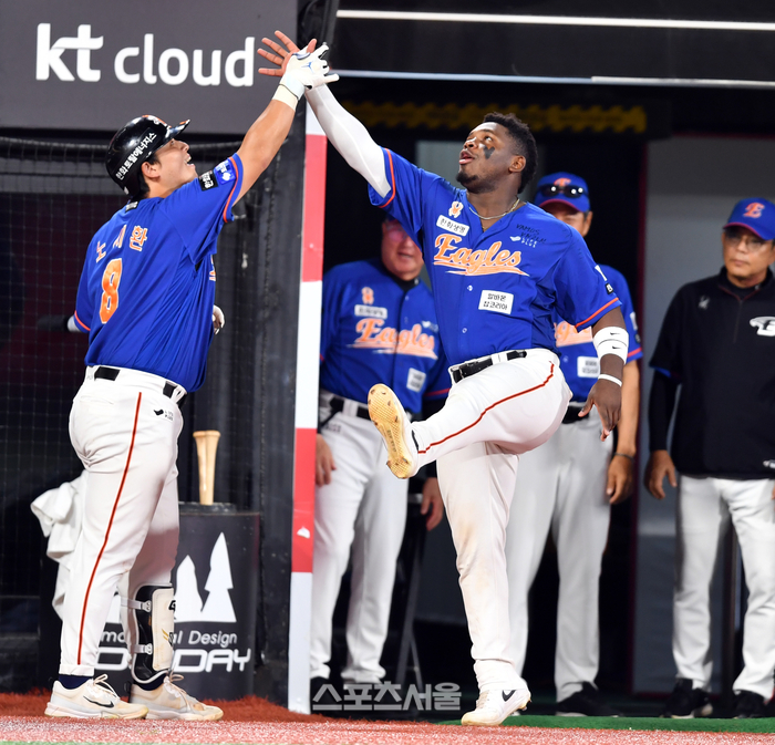 한화 4번타자 노시환이 31일 수원KT위즈파크에서 열린 2024프로야구 KT위즈와 한화이글스의 경기 5회초 선두타자로 나와 좌월 솔로홈런을 터트린 후 홈인하고 있다. 페라자와 자축하는 노시환. 2024.07.31.