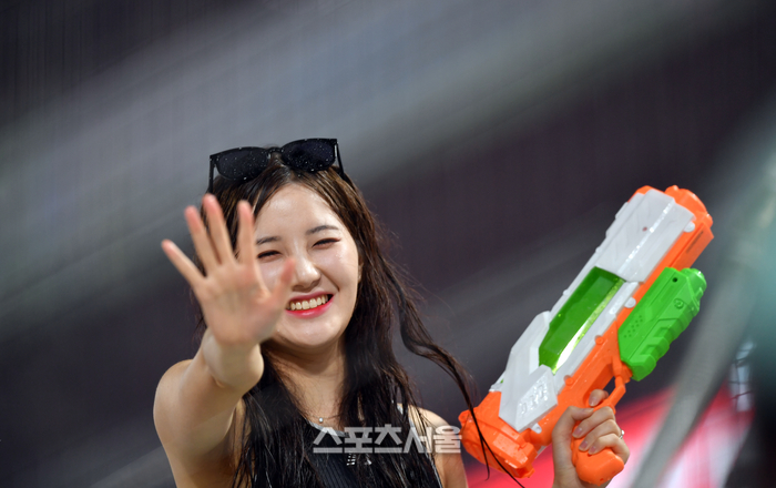 KT 치어리더가 31일 수원KT위즈파크에서 열린 2024프로야구 KT위즈와 한화이글스의 경기에서 물총을 들고 야구팬들에 손을 흔들며 흥을 돋우고 있다.. 2024.07.31.