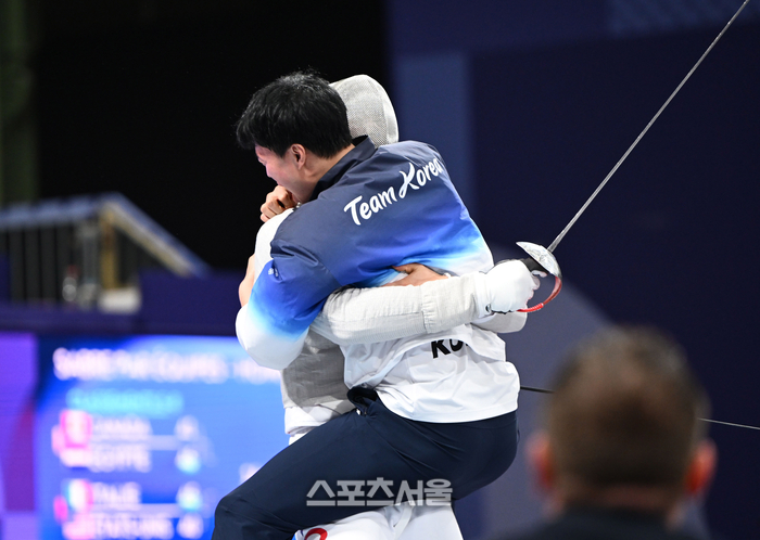 펜싱 사브르 남자 단체 대표팀 오상욱이 31일(한국 시간) 프랑스 파리 그랑팔레에서 열린 2024 파리올림픽 펜싱 남자 사브르 단체전 프랑스와의 준결승전에 서 승리한 뒤 원우영 감독과 포옹 기뻐하고 있다. 2024.7.31.