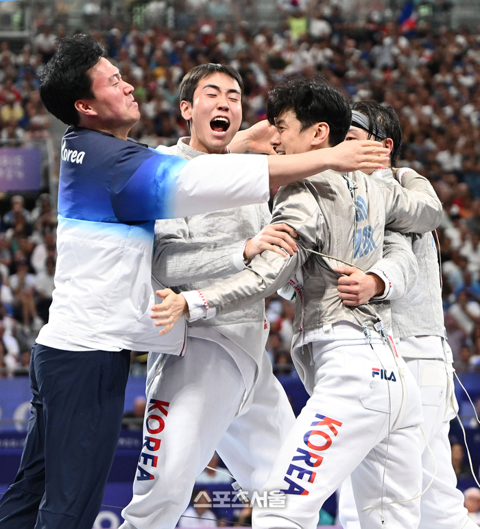 펜싱 사브르 남자 단체 대표팀이 31일(한국 시간) 프랑스 파리 그랑팔레에서 열린 2024 파리올림픽 펜싱 남자 사브르 단체전 프랑스와의 준결승전에 서 승리한 뒤 함께 기뻐하고 있다. 2024.7.31.