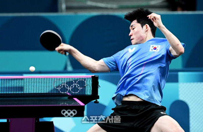 탁구 국가대표 장우진이 1일 (한국 시간) 프랑스 파리 사우스 파리 아레나 4에서 열린 2024 파리올림픽 탁구 남자 단식 16강전에서 일본의 토가미 ��스케를 상대로 공격을 하고 있다. 한국 장우진은 세트스코어 4-0로 승리하며 8강 진출에 성공했다. 2024. 8. 1.