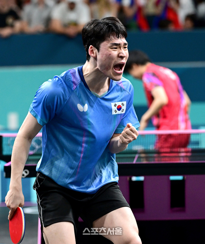 탁구 국가대표 장우진이 1일 (한국 시간) 프랑스 파리 사우스 파리 아레나 4에서 열린 2024 파리올림픽 탁구 남자 단식 16강전에서 일본의 토가미 ��스케를 상대로 득점한 뒤 기뻐하고 있다. 한국 장우진은 세트스코어 4-0로 승리하며 8강 진출에 성공했다. 2024. 8. 1.