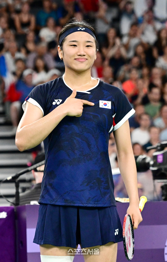 배드민턴 국가 대표 안세영이 1일(한국 시간) 프랑스 파리 포르트드라샤펠 아레나에서 열린 2024 파리 올림픽 배드민턴 여자 단식 조별리그 2차전에서 프랑스의 쉬에페이 치를 꺾고 8강 진출을 확정한 뒤 태극기를 가리키며 취재진을 향해 포즈를 취하고 있다. 2024. 8. 1.