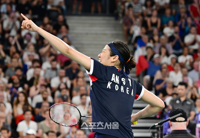 배드민턴 국가 대표 안세영이 1일(한국 시간) 프랑스 파리 포르트드라샤펠 아레나에서 열린 2024 파리 올림픽 배드민턴 여자 단식 조별리그 2차전에서 프랑스의 쉬에페이 치를 꺾고 8강 진출을 확정한 뒤 관중석을 향해 세리머니를 하고 있다. 2024. 8. 1.
