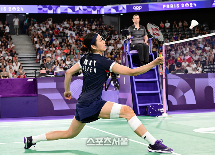 배드민턴 국가 대표 안세영이 1일(한국 시간) 프랑스 파리 포르트드라샤펠 아레나에서 열린 2024 파리 올림픽 배드민턴 여자 단식 조별리그 2차전에서 프랑스의 쉬에페이 치를 상대하고 있다. 안세영은 2-0으로 승리하며 8강 진출에 성공했다. 2024. 8. 1.