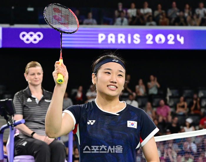 배드민턴 국가 대표 안세영이 1일(한국 시간) 프랑스 파리 포르트드라샤펠 아레나에서 열린 2024 파리 올림픽 배드민턴 여자 단식 조별리그 2차전에서 프랑스의 쉬에페이 치를 상대로 승리한 뒤 관중석을 향해 인사를 하고 있다. 안세영은 2-0으로 승리하며 8강 진출에 성공했다. 2024. 8. 1.