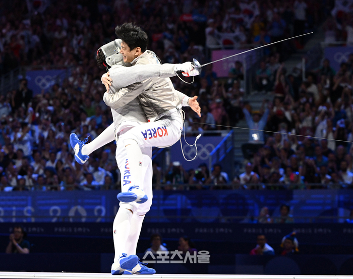 한국 펜싱 남자 대표팀의 오상욱과 구본길이 1일(한국 시간) 프랑스 파리 그랑팔레에서 열린 2024 파리올림픽 펜싱 남자 사브르 단체전에서 헝가리를 꺾고 금메달을 따내며 올림픽 3연패를 달성한 뒤 포옹을 하며 기뻐하고 있다. 2024. 8. 1.