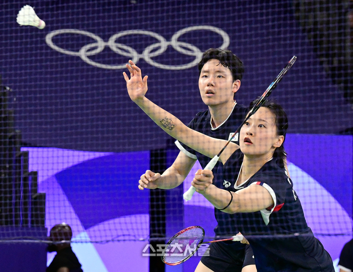 배드민턴 국가 대표 서승재-채유정 조가 1일(한국 시간) 프랑스 파리 포르트드라샤펠 아레나에서 열린 2024 파리 올림픽 배드민턴 혼성 복식 8강 경기에서 홍콩의 탕천만-체잉수에 조를 상대하고 있다. 2024. 8. 1.