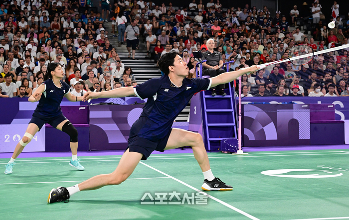 배드민턴 국가 대표 서승재-채유정 조가 1일(한국 시간) 프랑스 파리 포르트드라샤펠 아레나에서 열린 2024 파리 올림픽 배드민턴 혼성 복식 8강 경기에서 홍콩의 탕천만-체잉수에 조를 상대하고 있다. 2024. 8. 1.