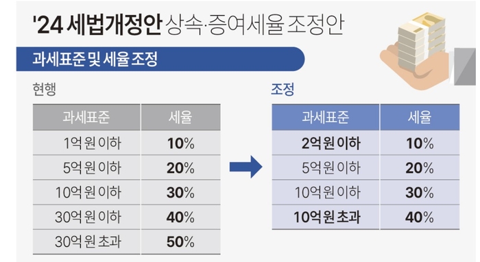 정부의 이번 상속세 세율 조정안은 30억원 초과시 50%의 최고세율을 40%로 하향 조정하는게 골자다.