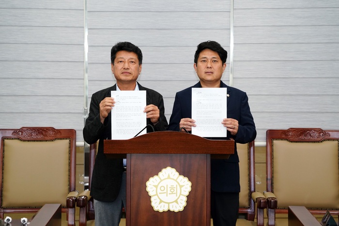 [스포츠서울ㅣ김기원기자]양구군의회 더불어민주당 김선묵, 김기철의원이 8월 1일 양구군의회 소회의실에서 “환경부는 양구군 방산댐 건설 계획을 즉각 중단하라”는 성명서를 발표했다.