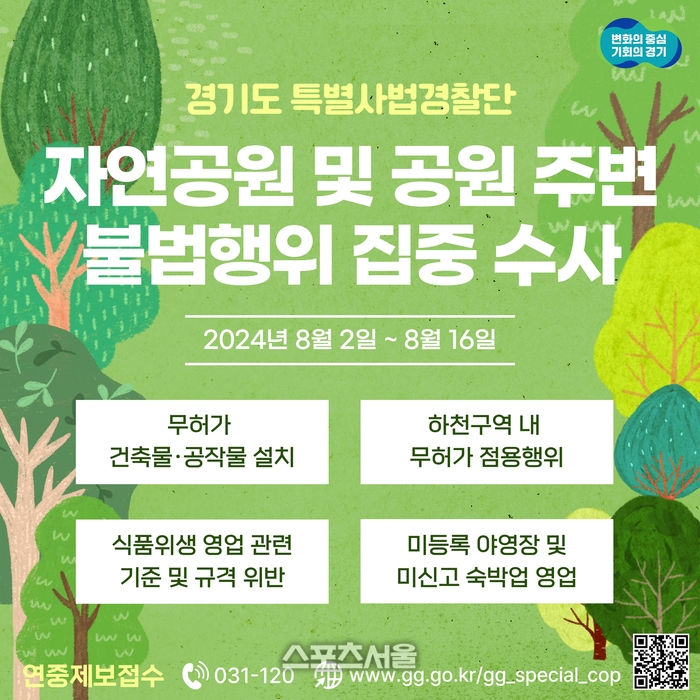 〔스포츠서울│수원=좌승훈기자〕경기도 특별사법경찰단은 2일부터 16일까지 자연공원과 공원 주변의 건축물, 하천구역 내 점용행위, 식품접객업소, 야영장, 숙박업소 대상으로 불법행위를 집중 수사한다고 1일 밝혔다.
