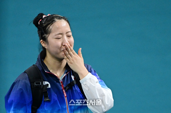 탁구 국가대표 신유빈이 1일(한국 시간) 프랑스 사우스 파리 아레나4에서 열린 2024 파리올림픽 탁구 여자 단식 8강에서 일본의 히라노 미우(세계 13위)에 풀게임 접전 끝에 게임 스코어 4대3으로 승리 뒤 관중석을 향해 손키스를 보내고 있다. 2024. 8. 1.