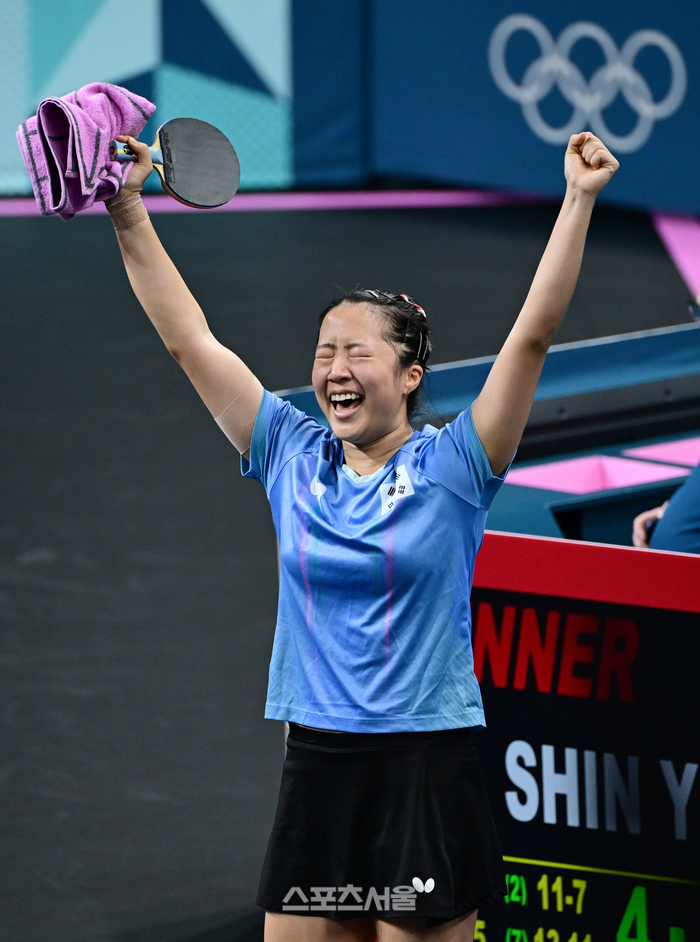 탁구 국가대표 신유빈이 1일(한국 시간) 프랑스 사우스 파리 아레나4에서 열린 2024 파리올림픽 탁구 여자 단식 8강에서 일본의 히라노 미우(세계 13위)에 풀게임 접전 끝에 게임 스코어 4대3으로 승리 뒤 눈물을 흘리고 있다. 2024. 8. 1.