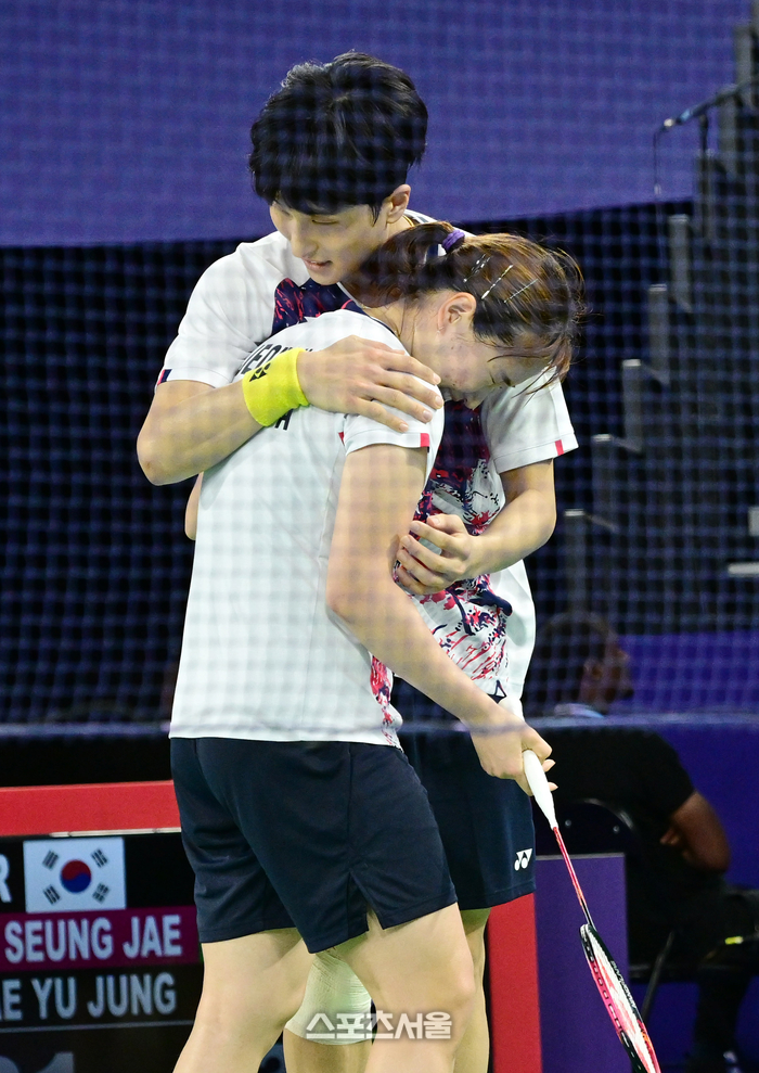 한국 배드민턴 국가대표 김원호-정나은 조가 2일(한국 시간) 프랑스 파리 포르트 드 라 샤펠 경기장에서 열린 2024 파리올림픽 혼성 복식 4강전에서 서승재-채유정 조를 꺾고 결승 진출을 확정한 뒤 함께 기뻐하고 있다. 2024. 8. 2.