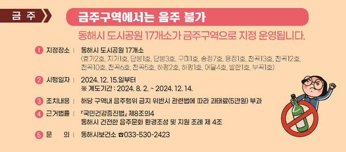 이번 동해시 금주 구역 지정은 「국민건강증진법」과 「동해시 건전한 음주문화 환경조성 및 지원 조례」에 따라 시행하는 것으로, 지난 7월 5일부터 7월 25일까지 20일간 ‘동해시 금주 구역 지정에 따른 행정예고’를 공고하였고 이에 관한 주민들의 의견 수렴 및 청취를 진행하였다.