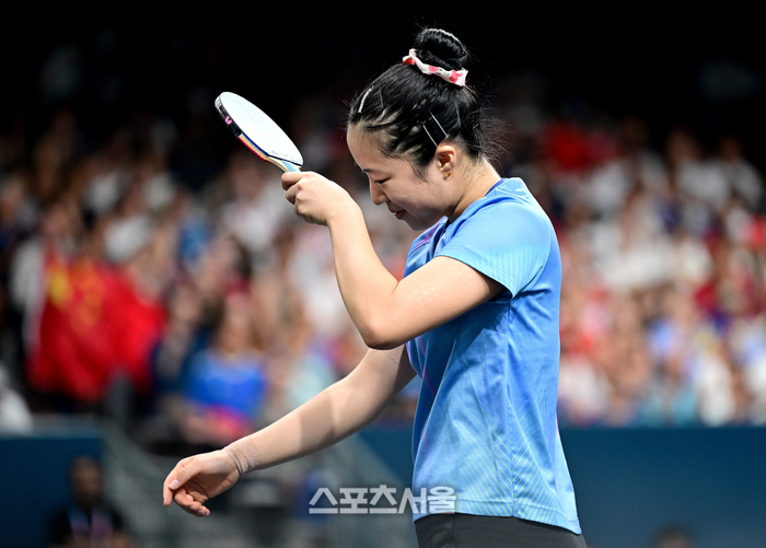 탁구 국가대표 신유빈이 2일(한국 시간) 프랑스 파리 사우스 파리 아레나4에서 열린 2024 파리올림픽 탁구 여자 단식 중국 첸멍과의 준결승전에서 실점에 아쉬워하고 있다. 신유빈은 중국 첸멍에게 게임 스코어 0-4(7-11, 6-11, 7-11, 7-11)로 패했다. 2024.08.02