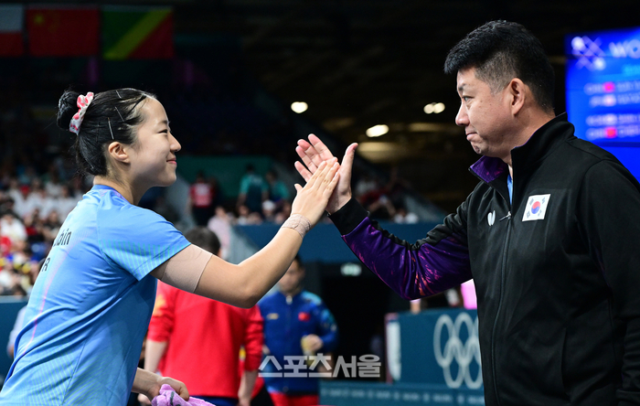 탁구 국가대표 신유빈이 2일(한국 시간) 프랑스 파리 사우스 파리 아레나4에서 열린 2024 파리올림픽 탁구 여자 단식 중국 첸멍과의 준결승전에 앞서 오광헌 감독과 하이파이브를 하고 있다. 신유빈은 중국 첸멍에게 게임 스코어 0-4(7-11, 6-11, 7-11, 7-11)로 패했다. 2024.08.02