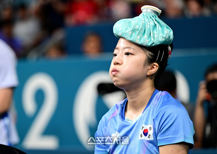 탁구 국가대표 신유빈이 2일(한국 시간) 프랑스 파리 사우스 파리 아레나4에서 열린 2024 파리올림픽 탁구 여자 단식 중국 첸멍과의 준결승전에서 3세트를 마친 뒤 머리에 얼음주머니를 올리고 생각에 잠겨 있다. 신유빈은 중국 첸멍에게 게임 스코어 0-4(7-11, 6-11, 7-11, 7-11)로 패했다. 2024.08.02