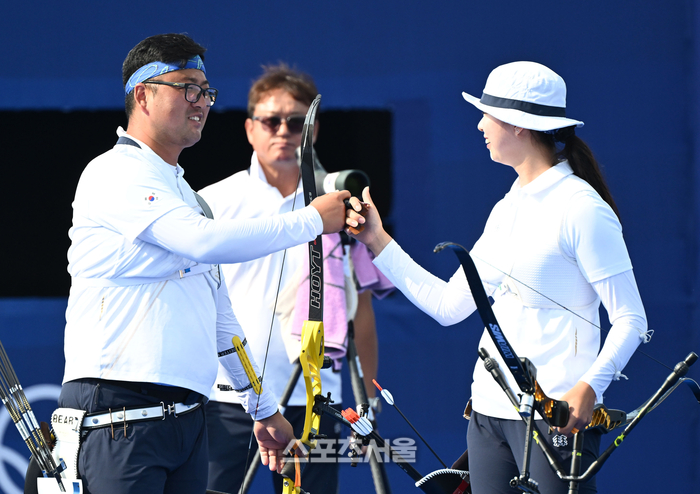 양궁 국가대표 김우진(왼쪽)과 임시현이 2일(한국 시간) 프랑스 파리 레쟁발리드에서 열린 2024 파리올림픽 양궁 혼성 단체전 대만의 레이 젠잉-다이 여우쉬안 조와의 16강전에서 슛오프 끝에 5대4로 승리한 뒤 주먹을 맞대고 있다. 2024. 8. 2.