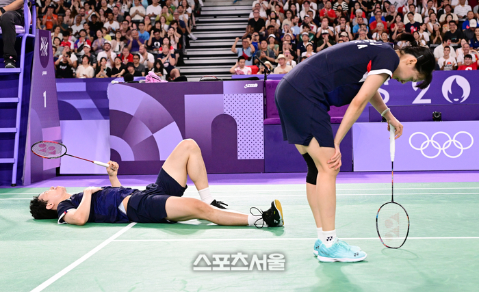 한국 배드민턴 국가대표 서승재-채유정 조가 2일(한국 시간) 프랑스 파리 포르트 드 라 샤펠 경기장에서 열린 2024 파리올림픽 혼성 복식 동메달 결정전에서일본의 와타나베-히가시노조를 상대로 실점을 한 뒤 아쉬워하고 있다. 서승재-채유정 조는 게임 스코어 0-2로 패하며 동메달 획득에 실패했다. 2024. 8. 2.