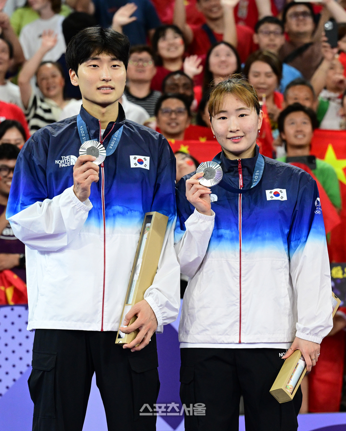 한국 배드민턴 국가대표 김원호-정나은 조가 2일(한국 시간) 프랑스 파리 포르트 드 라 샤펠 경기장에서 열린 2024 파리올림픽 혼성 복식 결승전에서 중국의 정쓰웨이-황야충 조에 패하며 은메달을 딴 뒤 메달을 내보이며 기념촬영을 하고 있다. 2024. 8. 2.
