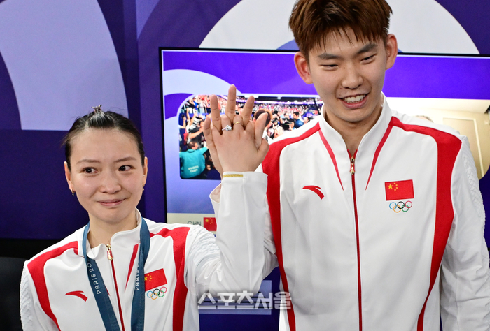 중국 배드민턴 대표팀의 황야충(왼쪽)이 3일(한국 시간) 프랑스 파리 라 샤펠 아레나에서 열린 2024 파리올림픽 배드민턴 혼성 복식에서 금메달을 딴 뒤 대표팀 동료 류위천으로부터 다이아몬드 반지와 함께 프로포즈를 받은 뒤 취재진을 향해 포즈를 취하고 있다. 2024. 8. 3.