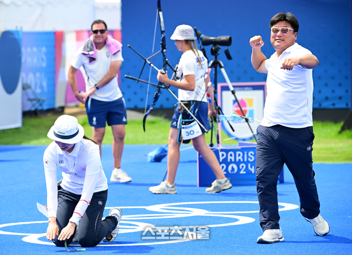 양궁 국가대표 남수현(왼쪽)이 3일(한국 시간) 프랑스 파리 앵발리드에서 열린 파리올림픽 양궁 여자 개인전 4강전에서 프랑스의 리사 바블랭을 꺾고 결승 진출을 확정한 뒤 양창훈 감독을 따라 관중석을 향해 큰절을 하고 ㅇ있다. 2024. 8. 3.