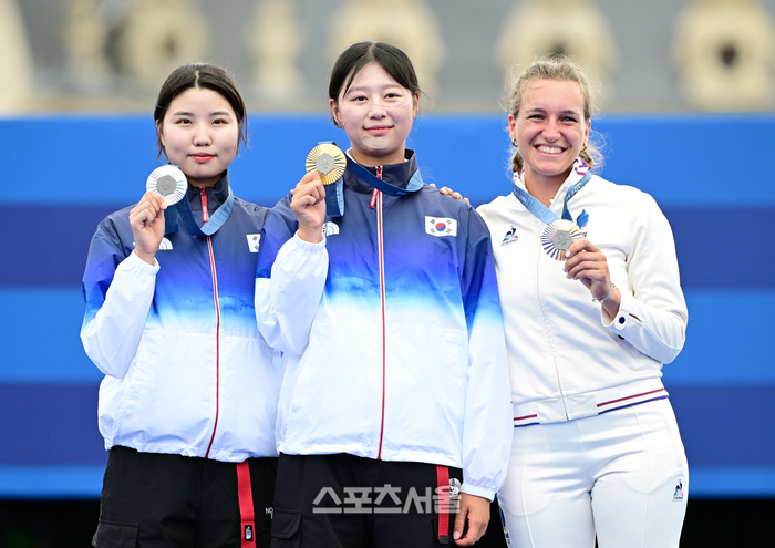 양궁 국가대표 임시현(가운데)와 남수현(왼쪽)이 3일(한국 시간) 프랑스 파리 앵발리드에서 열린 파리올림픽 양궁 여자 개인전에서 금메달과 은메달을 딴 뒤 동메달리스트 프랑스의 리사 바르블랭과 기념촬영을 하고 있다. 2024. 8. 3.
