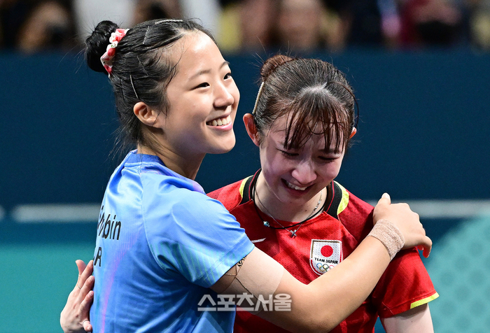 탁구 국가대표 신유빈(왼쪽)이 3일(한국 시간) 프랑스 파리 사우스 파리 아레나4에서 열린 2024 파리올림픽 탁구 여자 단식 동메달결정전에서 일본의 하야타 히나에게 패한 뒤 상대 선수와 웃으며 인사를 하고 있다. 2024.08.03