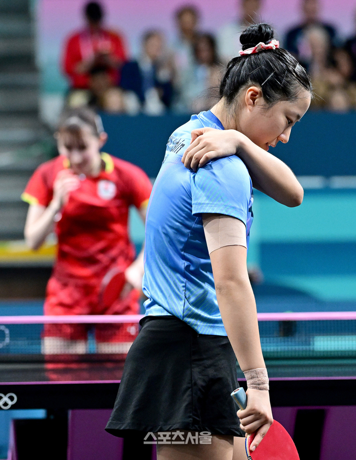 탁구 국가대표 신유빈이 3일(한국 시간) 프랑스 파리 사우스 파리 아레나4에서 열린 2024 파리올림픽 탁구 여자 단식 동메달결정전에서 일본의 하야타 히나를 상대하던 중 어깨를 매만지고 있다. 2024.08.03