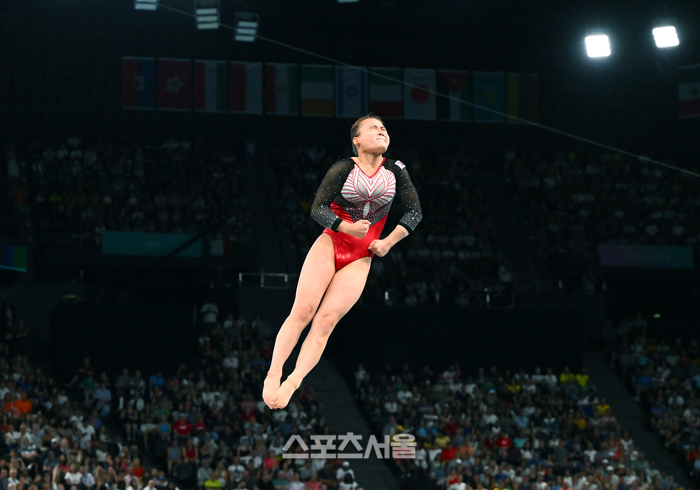 체조 국가대표 여서정이 4일(한국 시간) 프랑스 파리 베르시 아레나에서 열린 2024 파리올림픽 체조 여자 도마 결선에서 연기를 펼치고 있다. 여서정은 최종 7위를 기록했다. 2024. 8. 4.