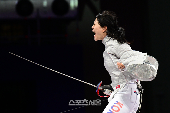 한국 펜싱 여자 사브르 대표팀(윤지수, 전하영, 최세빈, 전은혜)의 전은혜(왼쪽)가 4일(한국 시간) 프랑스 파리 그랑팔레에서 열린 2024 파리올림픽 펜싱 여자 사브르 단체 결승전에서 우크라이나를 상대로 득점을 한 뒤 기뻐하고 있다. 2024. 8. 4.